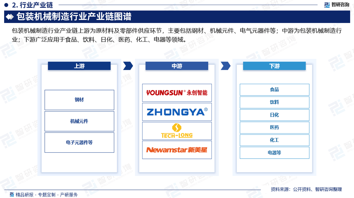 包拆机械制制行业财产链上逛为原材料及零部件供应环节,次要包罗钢材、机械元件、电气元器件等;中逛为包拆机械制制行业;下逛普遍使用于食物、饮料、日化、医药、化工、电器等范畴。