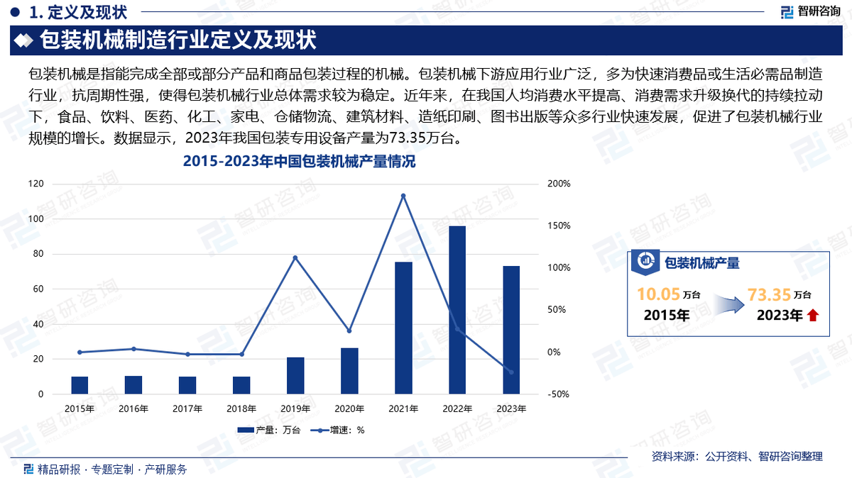 正在当下高度消息化的社会布景下,精准的数据阐发取深切的行业研究已成为企业计谋规划、市场拓展以及投资决策不成或缺的指南针。本研究演讲基于智研团队对包拆机械制制行业的深刻理解取精准把握,通过采集全球范畴内的行业数据,对行业的过去、现正在取将来进行了全面、系统的分解。深切挖掘了各个细分市场的运转纪律,对市场容量、增加速度、合作款式以及盈利模式等环节目标进行了详尽的量化阐发取质性解读。演讲内容不只涵盖了宏不雅经济的走势阐发、财产政策的深度解读,还包罗了买方行为的详尽描绘、手艺立异的趋向预测。我们分析使用了定量阐发取定性等多种研究方式,力图正在确保数据切确性的同时,也能捕获到市场动态中的微妙变化。此外,我们还出格关心了全球范畴内的行业领先企业,通过对比阐发它们的运营策略、市场结构以及立异能力,为业界读者供给了贵重的行业洞察取运营。做为业内出名的研究机构,智研研究团队深知高质量的研究演讲对于企业决策的主要性。因而,正在编撰本演讲的过程中,我们一直科学、严谨的研究立场,力图通过详实的数据、深切的阐发以及研判性的概念,为读者供给一份实正有价值的行业指南。包拆机械是指能完成全数或部门产物和商品包拆过程的机械。包拆过程包罗成型、充填、封口、裹包等次要包拆工序,以及清洗、干燥、杀菌、贴标、捆扎、集拆、拆卸等前后包拆工序转送,选别等其他辅帮包拆工序。按功能分歧,包拆机械可分为充填机械、灌拆机械、封口机械、裹包机械、标签机械、清洗机械、干燥机械、杀菌机械、捆扎机械、集拆机械等。我国包拆机械行业属于新兴行业,颠末多年的成长,现已成为机械工业中的十大行业之一。包拆机械下逛使用行业普遍,多为快速消费品或糊口必需品制制行业,抗周期性强,使得包拆机械行业总体需求较为不变。近年来,正在我国人均消费程度提高、消费需求升级换代的持续拉动下,食物、饮料、医药、化工、家电、仓储物流、建建材料、制纸印刷、图书出书等浩繁行业范畴出产企业把握成长机缘,不竭扩大出产规模,提高市场所作力,为我国包拆机械行业快速成长供给了无效保障,推进了包拆机械行业的快速成长。数据显示,2023年我国包拆公用设备产量为73。35万台。
