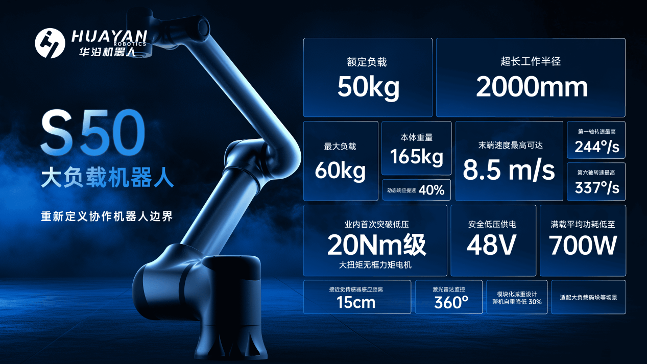 此次全球首秀的S50大负载协做机械人以“50KG级负载、8。5米/秒结尾速度、48V平安电压”三大特征从头定义行业新高度。华沿机械人手艺担任人暗示,S50做为全球首款采用48V低压供电、最大负载可达60KG的大负载协做机械人,它冲破性地搭载了华沿机械人自从研发的20N·m级大扭矩无框力矩电机,并基于电机取机械人关节一体化设想、系统热办理手艺,全体能耗下降60%。此外,S50采用的编码器无需内置电池供电,后期更简单、更高效。”它具备激光雷达、接近觉传感器等多沉平安防护能力,当操做人员、异物进入机械臂工做范畴时,可精准识别并自动完成降速、人、物侵入150mm范畴内,机械臂完全遏制工做,保障机械臂取工人平安。